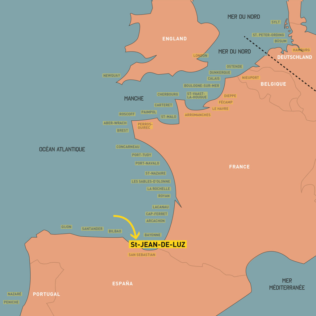 • La côte Espagnole dans la continuité de la notre est située dans cette même zone de marée. Pas de correction pour les horaires de Hondarribia située à la frontière jusqu’à Santander la capitale de la Cantabrie. Il faut apporter maximum 30 minutes de corrections aux horaires des marées à La Coruña en Galice.