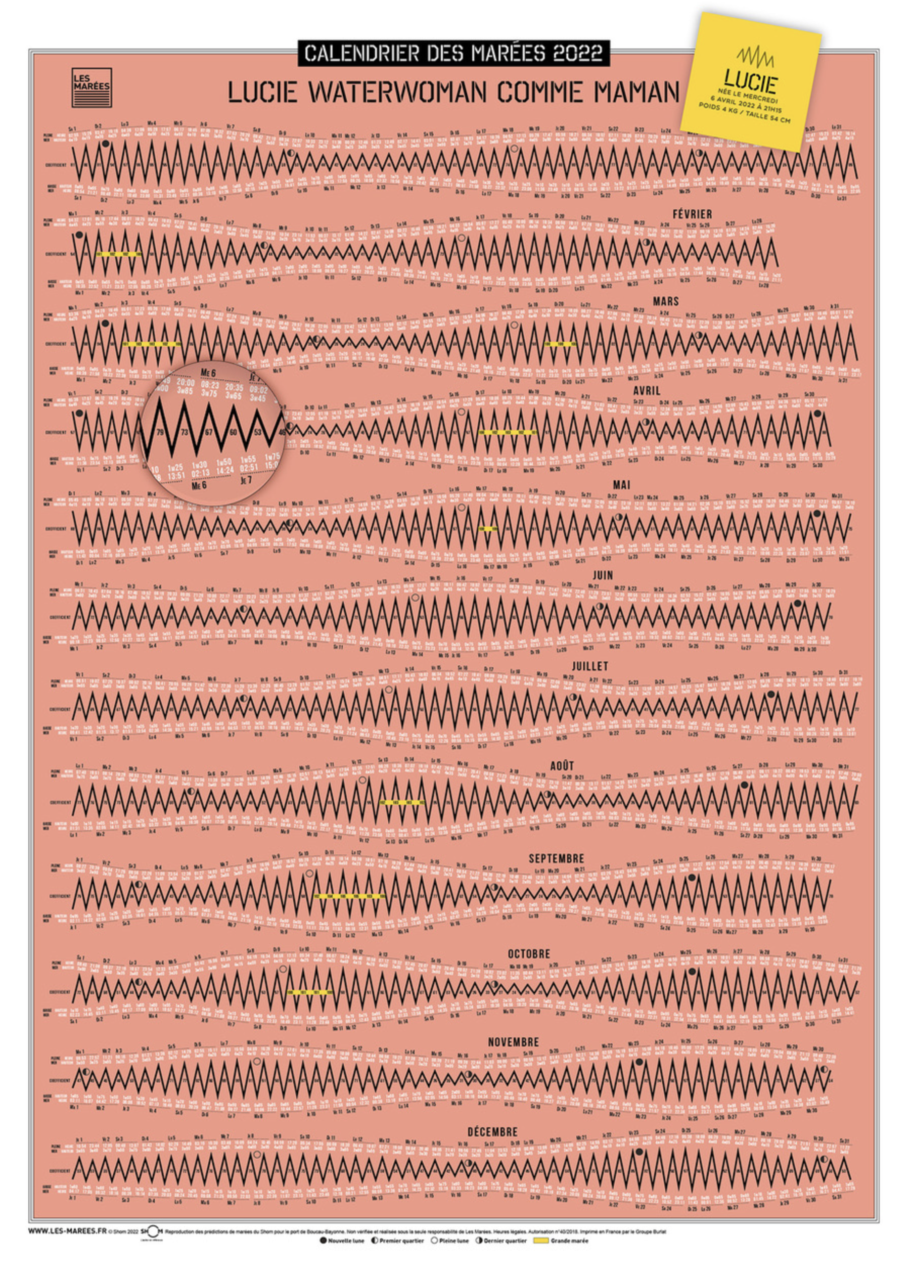 Notre calendrier est aussi un objet décoratif qui égayera et embellira votre intérieur. Simple à lire et à comprendre, il constitue également un excellent support pédagogique pour initier petits et grands au phénomène fascinant des marées.