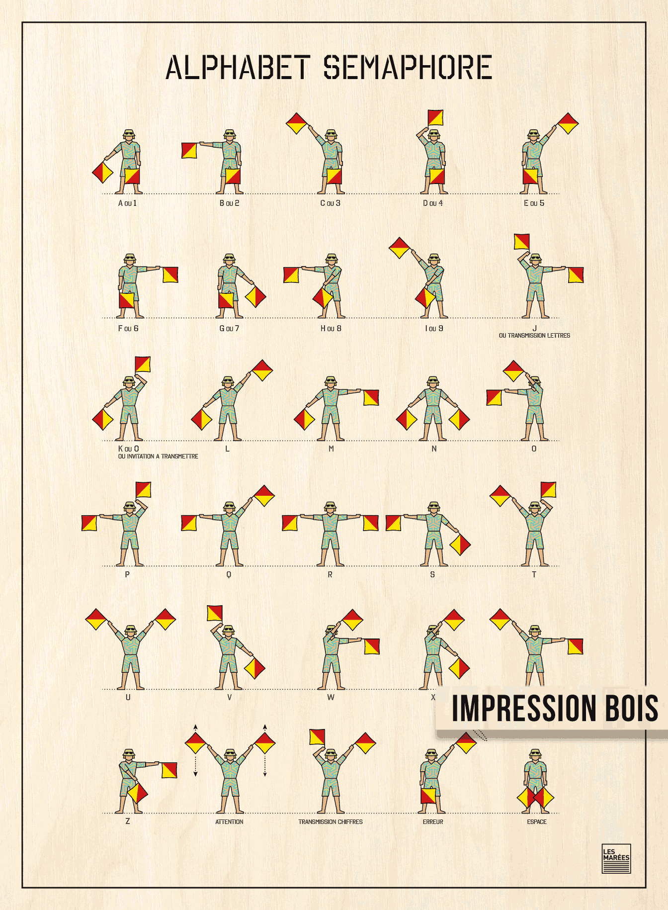 l’Alphabet Sémaphore revisité dans un style moderne. Ce langage visuel, jadis utilisé dans la marine nationale pour transmettre des messages, prend une toute nouvelle allure avec un personnage féminin arborant une tenue tendance, coiffée d’un bob décontracté et vêtu d’une tenue estivale. Existe également en version garçon coiffé d’un bob décontracté et vêtu d’une chemise hawaïenne.