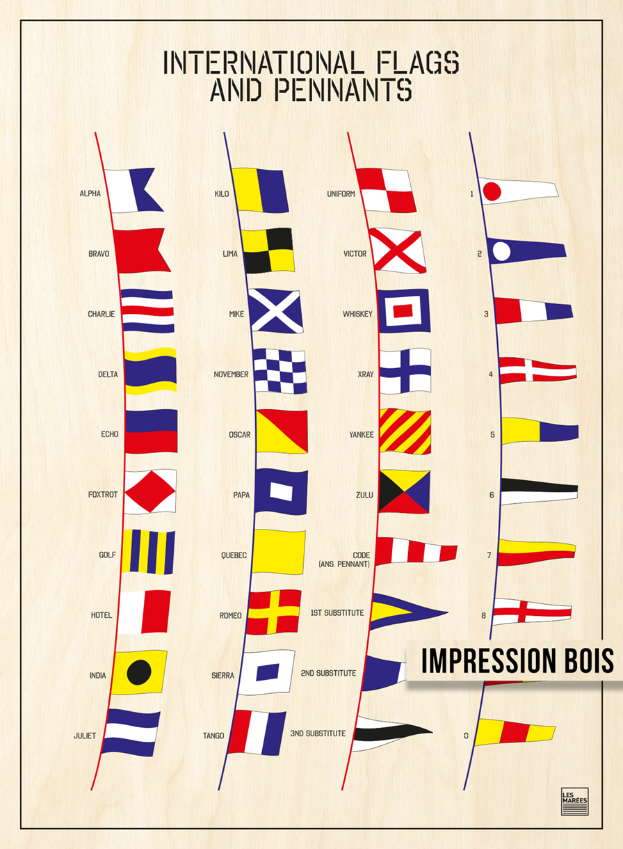 Voyagez au cœur de la communication maritime avec notre illustration du code international des « Drapeaux et Fanions ». Chaque flottant correspond à une lettre, un numéro, un mot, une signification créant ainsi une expérience visuelle et éducative.