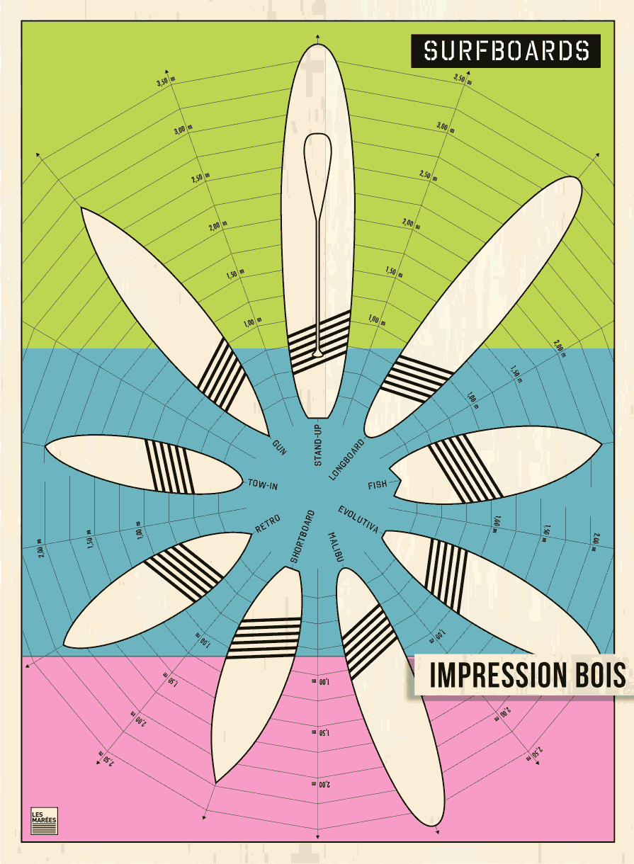 Surfeur, surfeuse aguerri(e) ou simplement amoureux de la culture surf, l’illustration « Quiver » est une invitation à rêver à la collection de « boards » parfaite : Short-board, Rétro, Tow-in, gun, Malibu, Evolutiva, Fish, Longboard et Stand-up. Graduation des dimensions des planches en toile d’araignée.